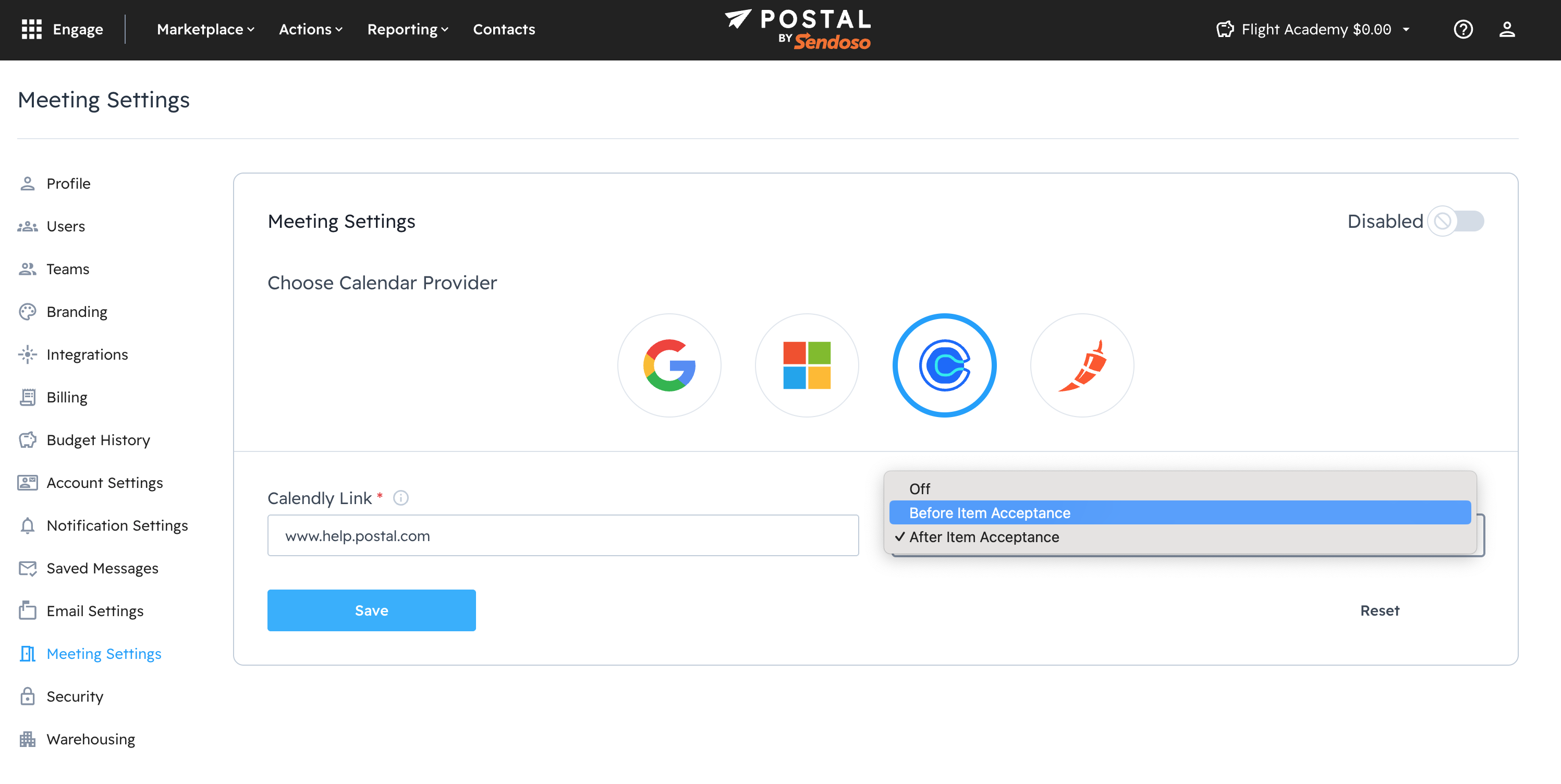 Postal integrates with Calendly to make sure you don't miss a meeting–or an opportunity. First, click your profile picture and select "Meeting Settings" from the Profile Settings menu on the left-hand side.