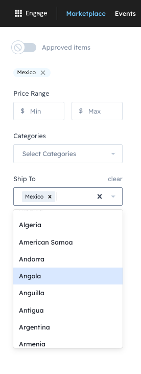 Other items can be found by searching and adjusting filters. To see if an Item is compatible with the country you are trying to ship to, simply go to the Filter column on the left-hand side of the Marketplace, scroll down to "Ship To" and type or select the country of your choice.