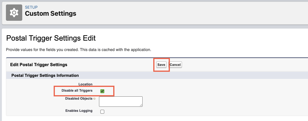 5. You can click the checkbox next to Disable all Triggers to have no Apex jobs run. Then Save.