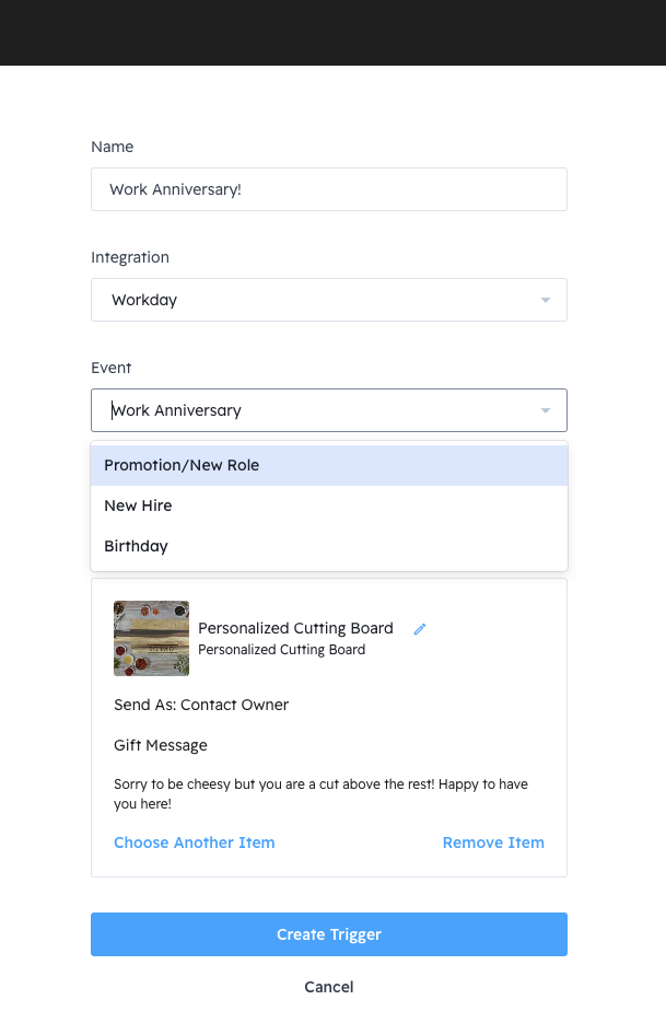 Note! To create a trigger you’ll need to have the Admin role. All dates are based on the Hire Date in Workday. All triggers will be sent to the Worker's work email |