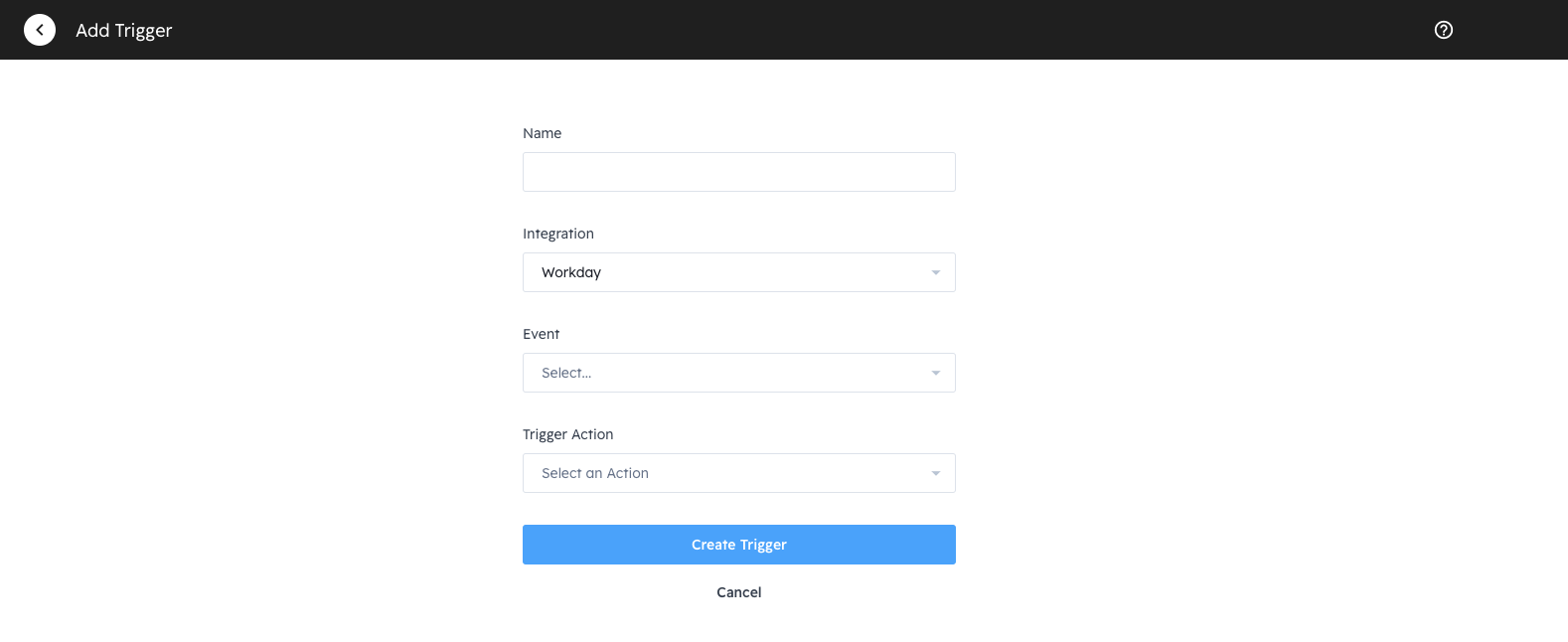 - Title your trigger from the Create a Trigger page and then select the Workday integration.