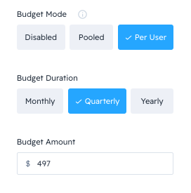 Budget Mode is automatically set to Disabled. You can choose Pooled or Per User now if you'd like, or you can change this later. Select Save to finish this process.