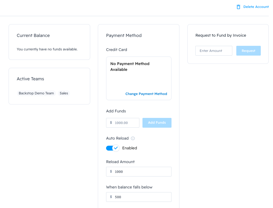 The balance is the available funds in the Billing Account. Funds can be added manually or be set to Auto-Reload. The Current Balance will reflect the available funds.