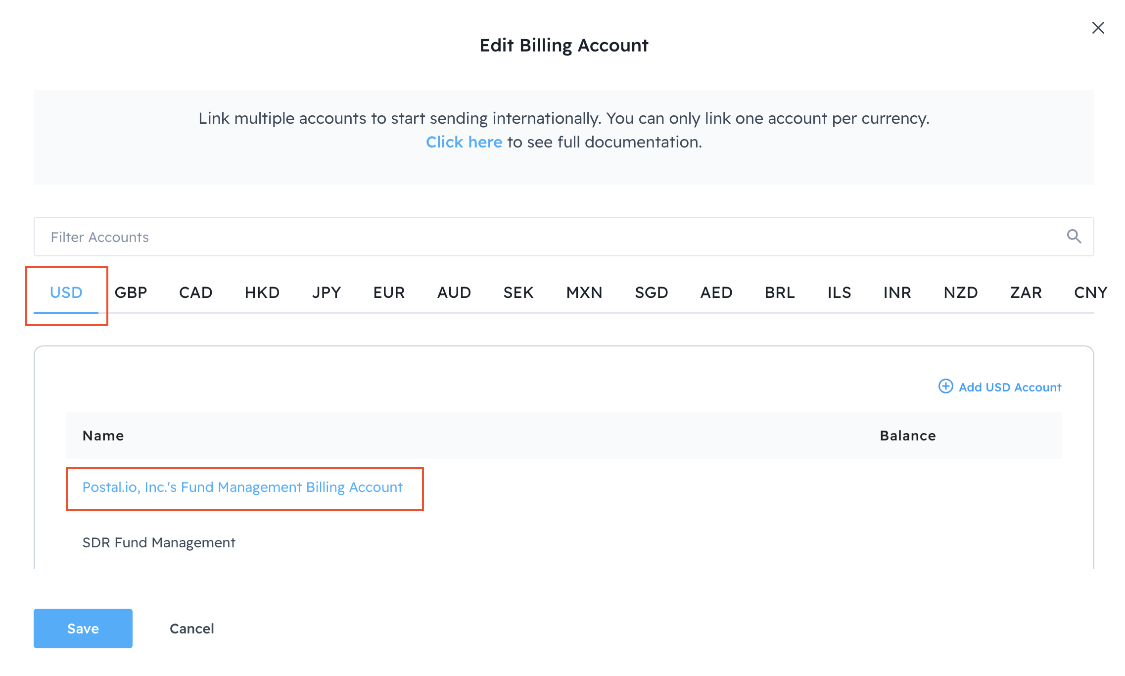 Select an account from the target currency column. Upon selection, the account name will turn blue. Notice in the image below, that USD is selected and one Billing Account is in blue letters. That Billing Account is the USD account tied to this team.