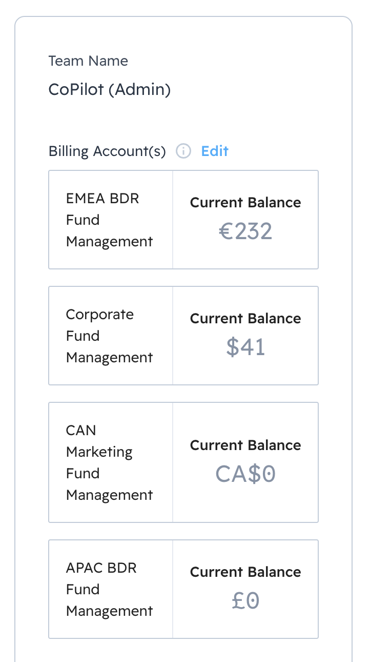 This article discusses how to link teams to multiple Billing Accounts. It's important to note that each Billing Account can have one currency type assigned to it. The result is that all team members have access to funds in different currencies that allow them to send items internationally.