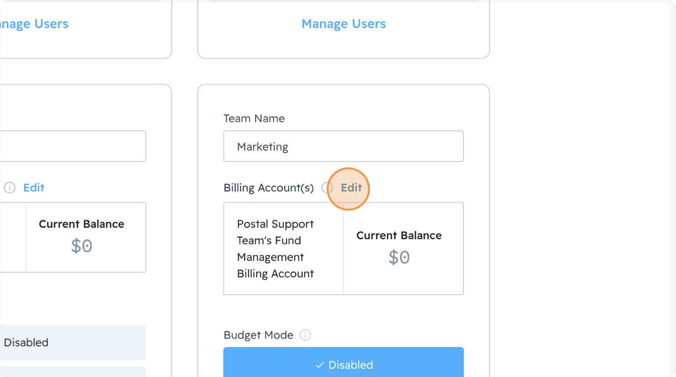 Next, navigate to https://app.postal.io/billing/accounts (Profile & Settings > Billing > Team Budgets). Find the Team you wish to link a billing account to and then select Edit in the Billing Accounts section.