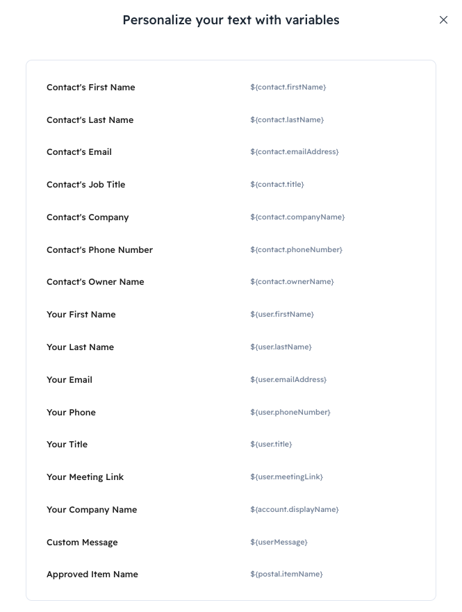 Variables will auto-populate a variety of information in your sends, including name (first and last), company, title, phone number, and email.