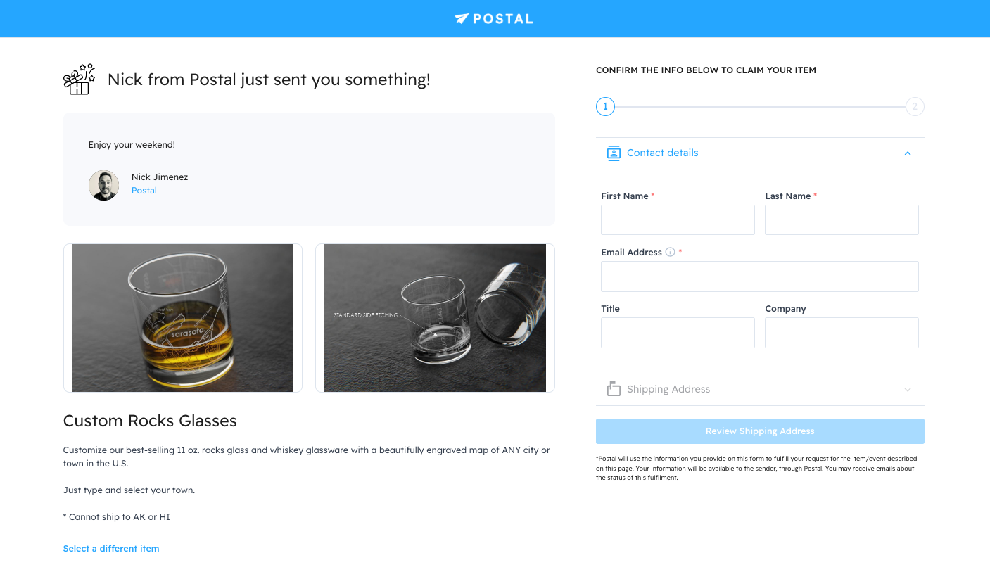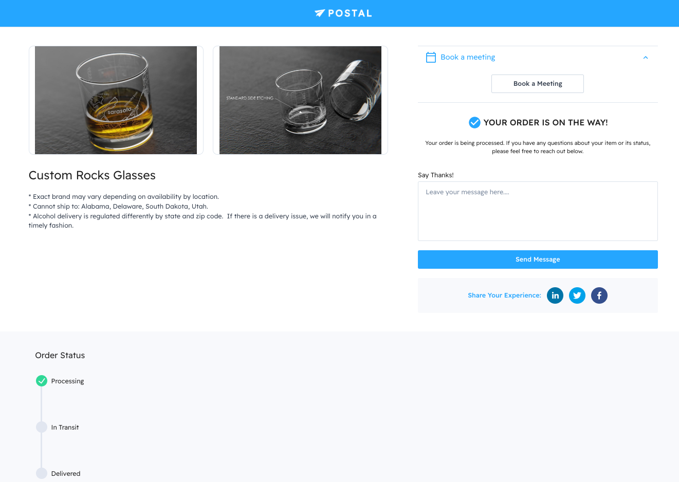 Order confirmed. You can also use this landing page to track your order (below), say thanks to the sender, and share your experience on social media!
