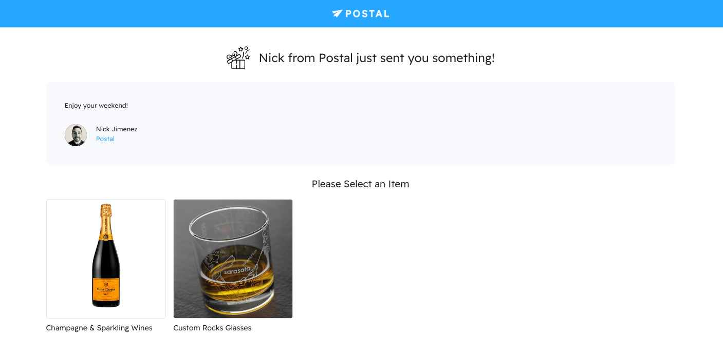 When you receive a Collection, you will be prompted to accept the link in the Personalized Email or through a MagicLink. Either way, you will be redirected to a landing page where you are given the option to choose one gift from the collection you were sent.