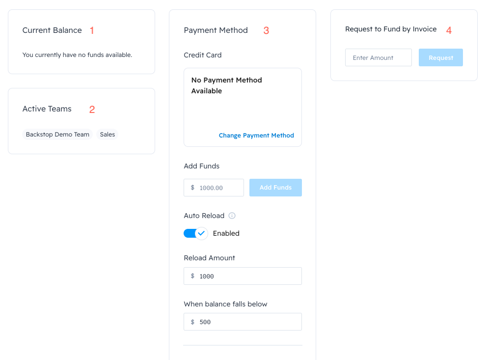 Note: Accounts with a currency that is not USD will not have a Payment Method section and can only be funded by invoice