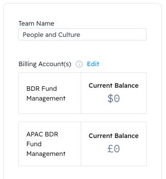 Second, find the team you wish to remove the fund management account from, and click the Edit button next to the Billing Account(s) heading