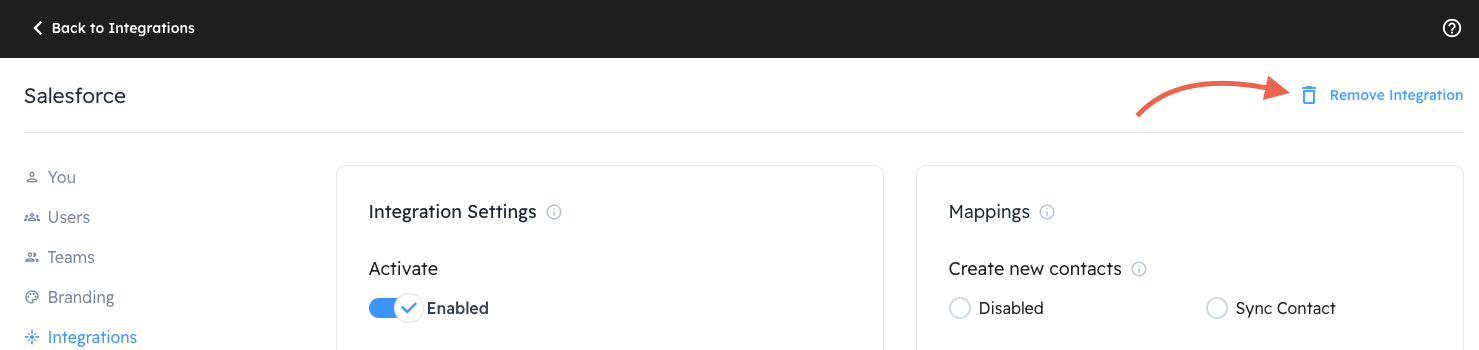 Removing an integration is quick and easy. Simply go to Profile Settings > Integrations and select the integration you wish to remove (the integration button should say Enabled). From here, you'll be brought to your integration options screen.