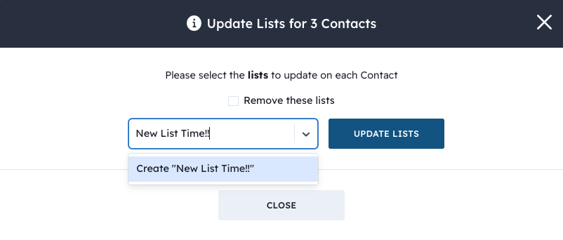 - Once you have created the new list or selected an additional list, select Update Lists then Close