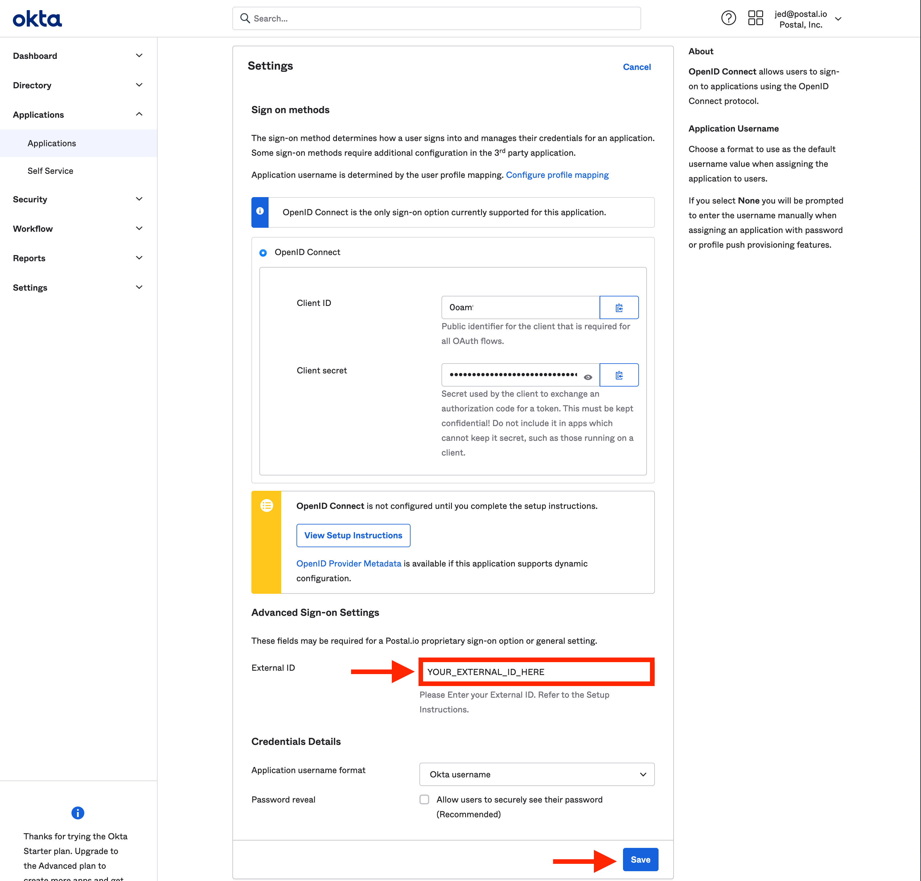 Step 7: In Okta, paste the External ID in the Advanced Sign-on Settings > External ID and select 'Save'