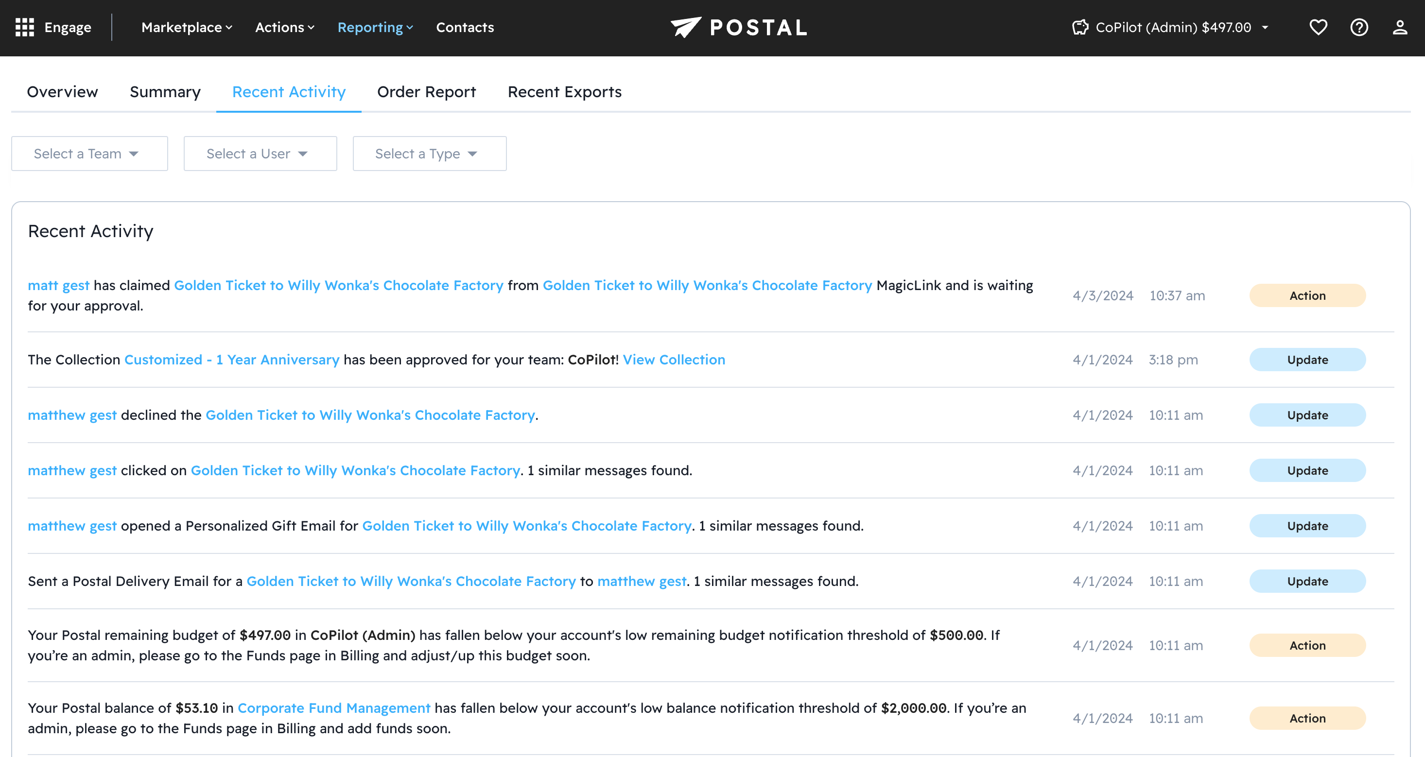 The Recent Activity tab shows recent activity within the Postal app. Users will see their own information, Admins and Managers will have the ability to sort by User and Team. For more information about this tab, check out our article on Recent Activity.