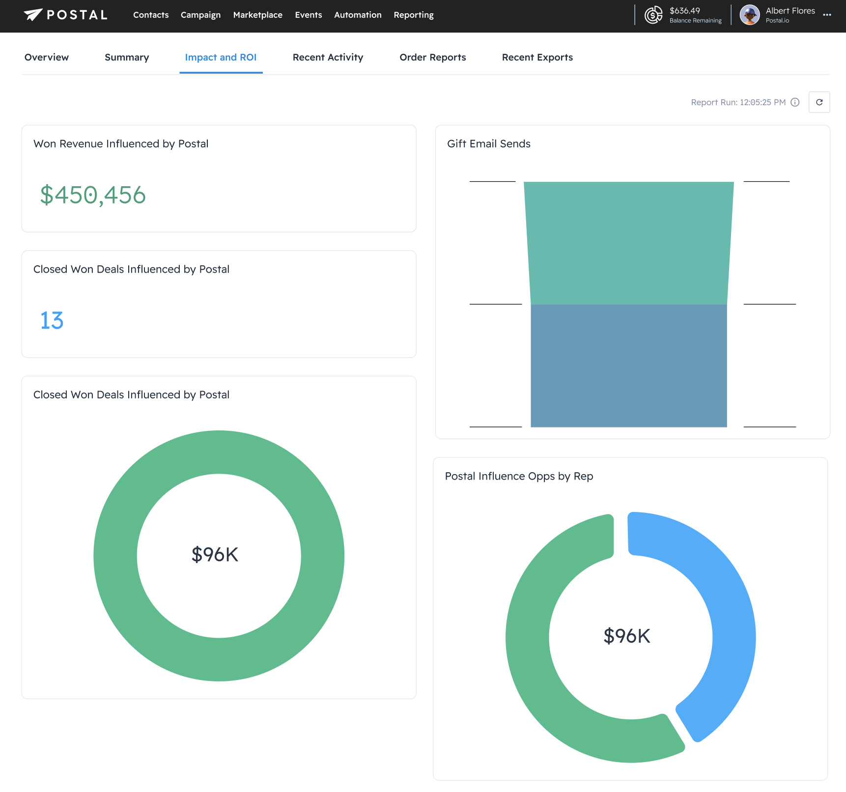 The Impact and ROI tab surfaces for Salesforce Managed Package accounts only. Even if you have the Salesforce integration, if you do not have the Managed Packaged you will not see this tab. This tab surfaces the same information you see in the Salesforce dashboard, just in Postal. For more information, check out this article.