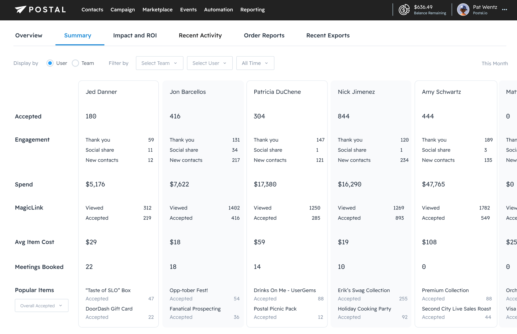 The Summary tab outlines Postal data by User. As a User, you will only see your own data here. As an Admin or Manager, you will be able to sort by User or Team. You can see accepted sends, engagement, Average Item Cost, and more.