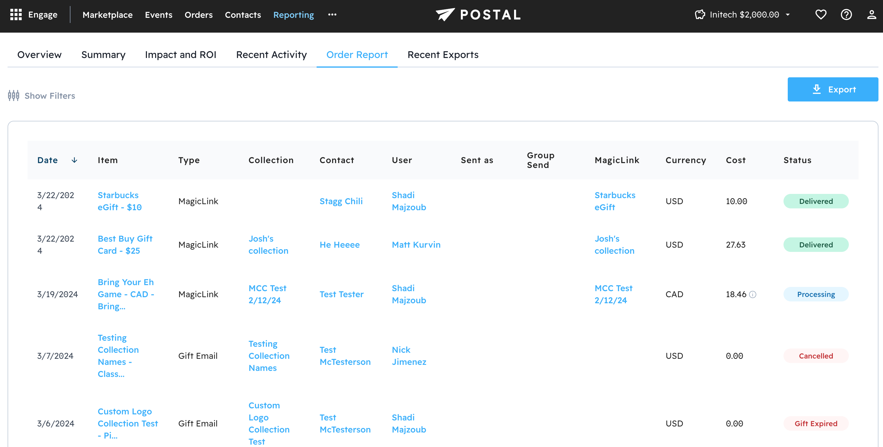 The Order Report tab allows you to filter by status, date created, item, Campaign, Contact, or MagicLink. From this page, you are able to export a report to Excel format if desired.