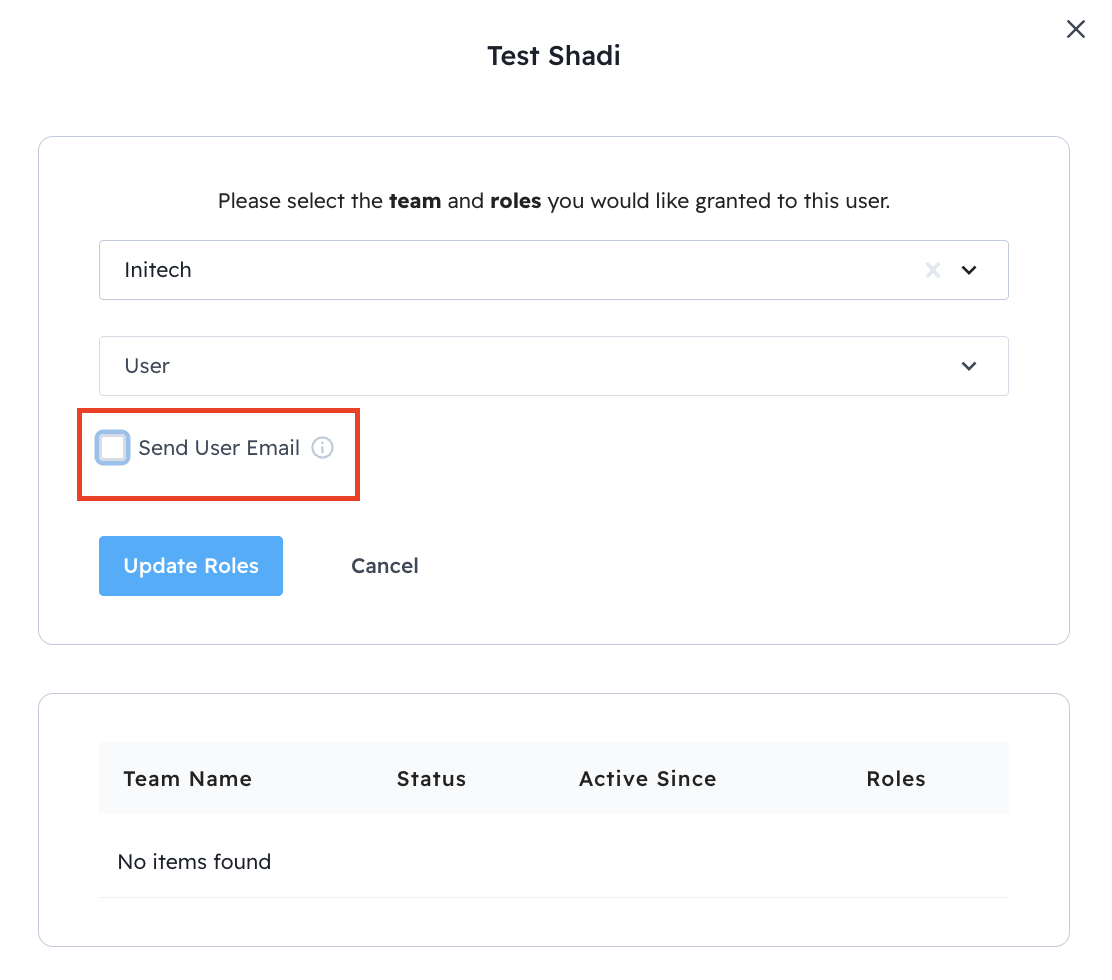 - Invite a new user by filling out their email, assigning them a team, and choosing which role(s) they will receive