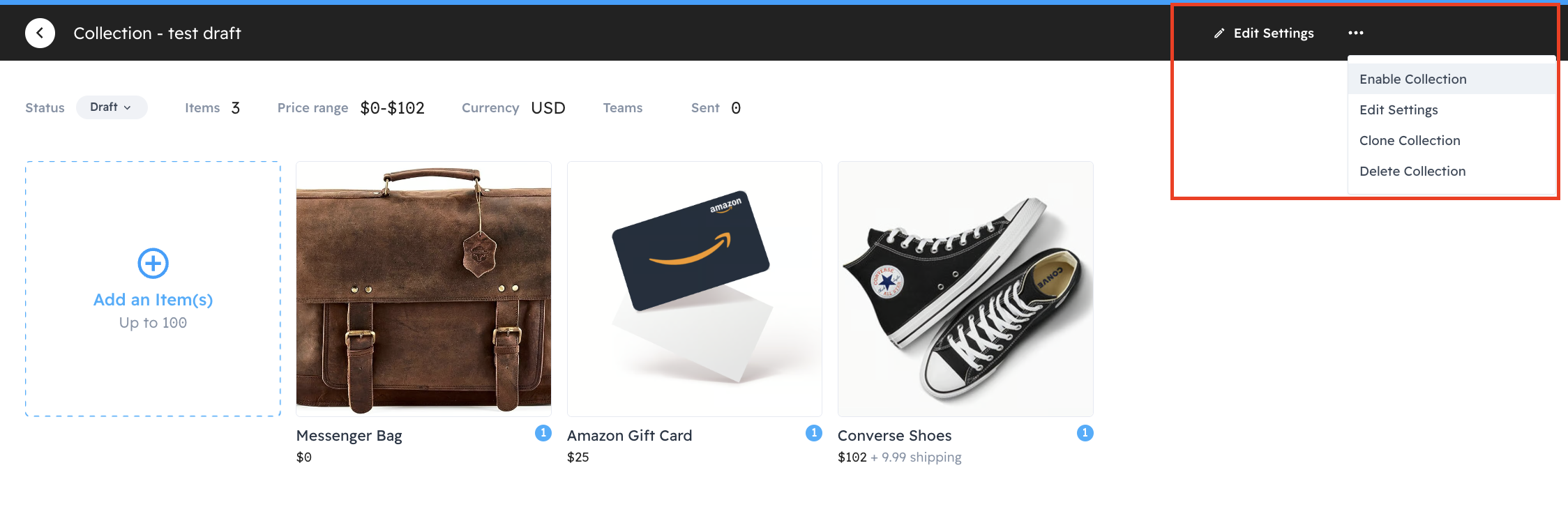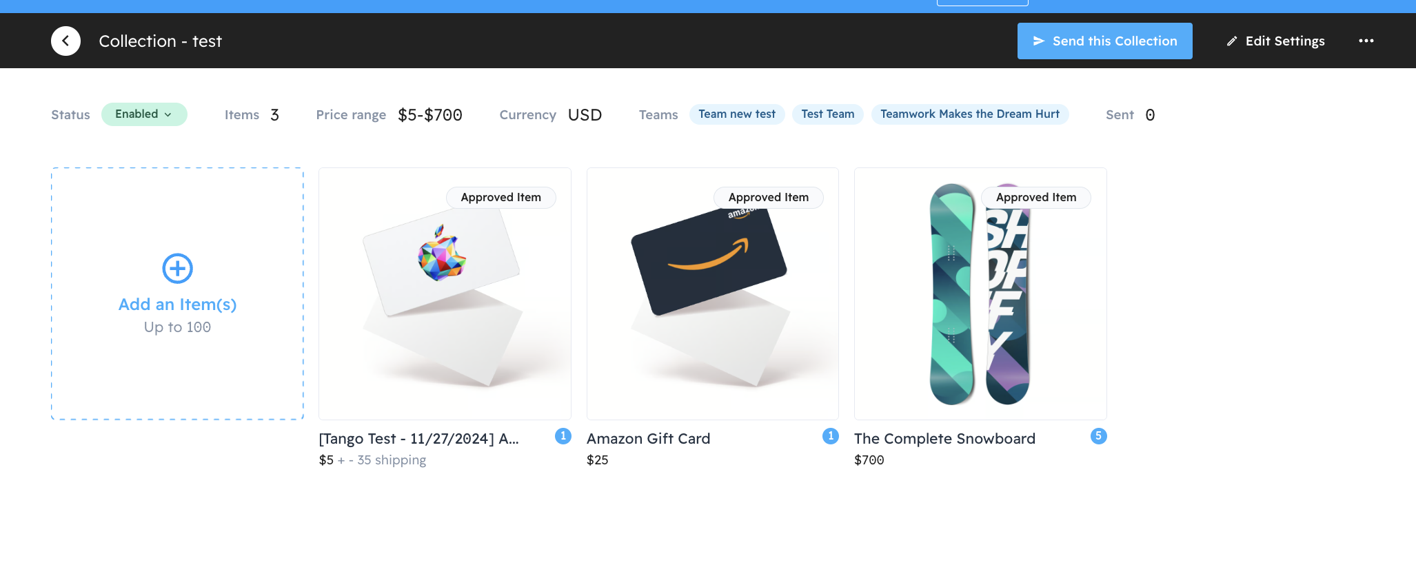 Your collection has been successfully created! From here, you can add items, make edits, or, if everything looks good, proceed with sending it.