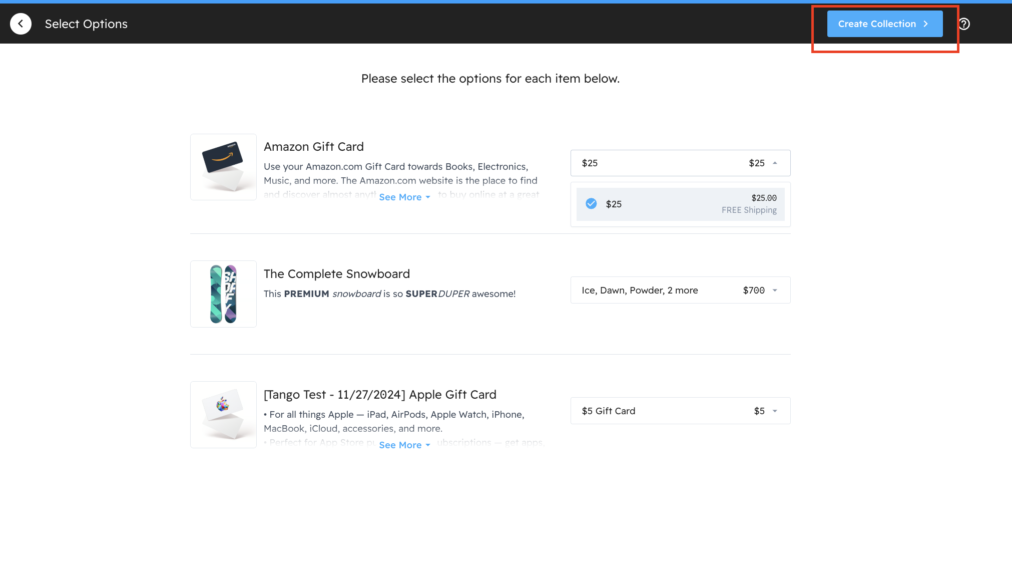 *The recipient will only be able to choose one of the options in the Collection and there is no way to bundle gifts via collections.