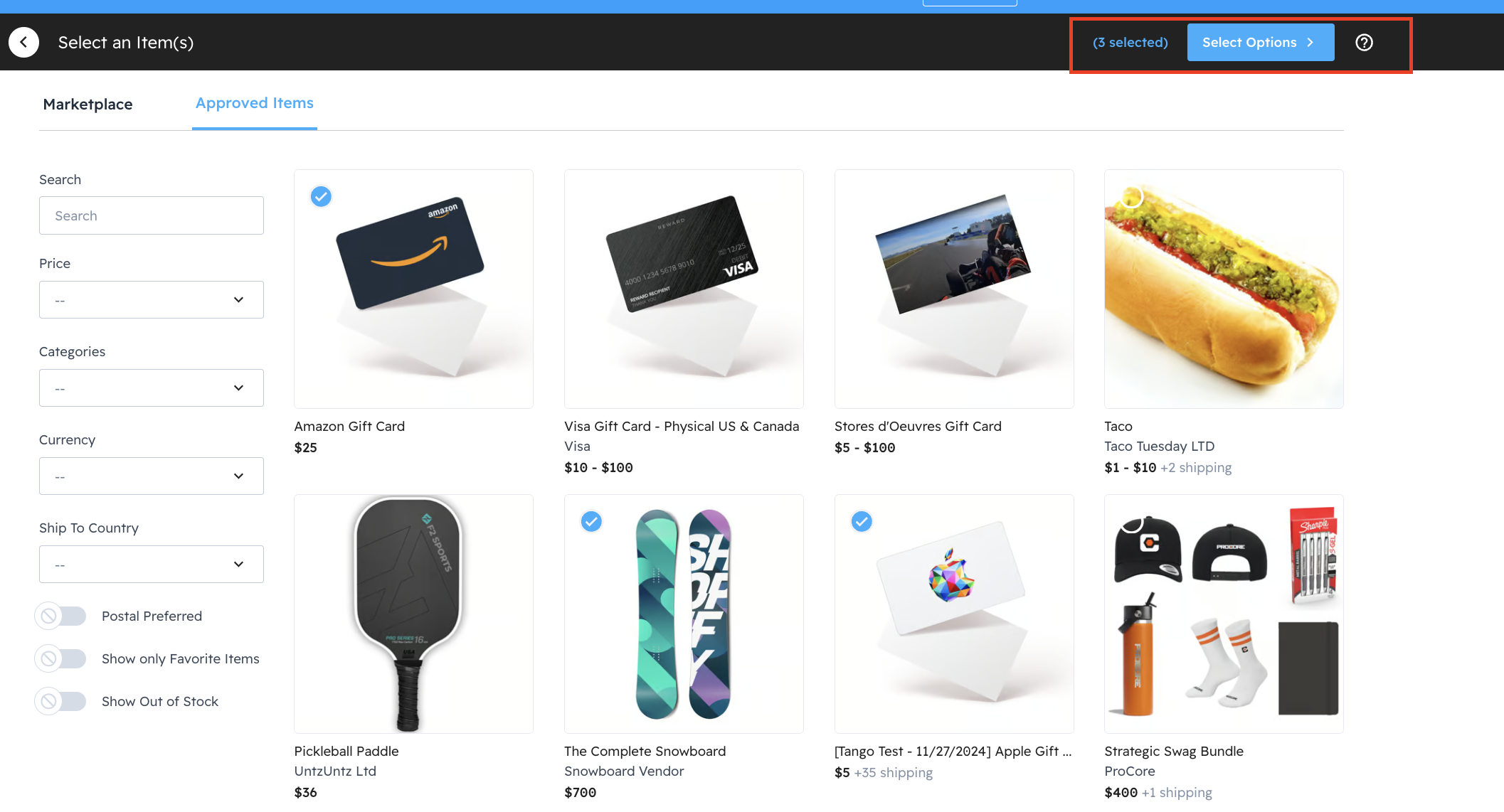 Begin to add items to your collection. You can choose between Approved items or items within the Marketplace. Once you’ve selected all your items, click on Select Options on the top right.