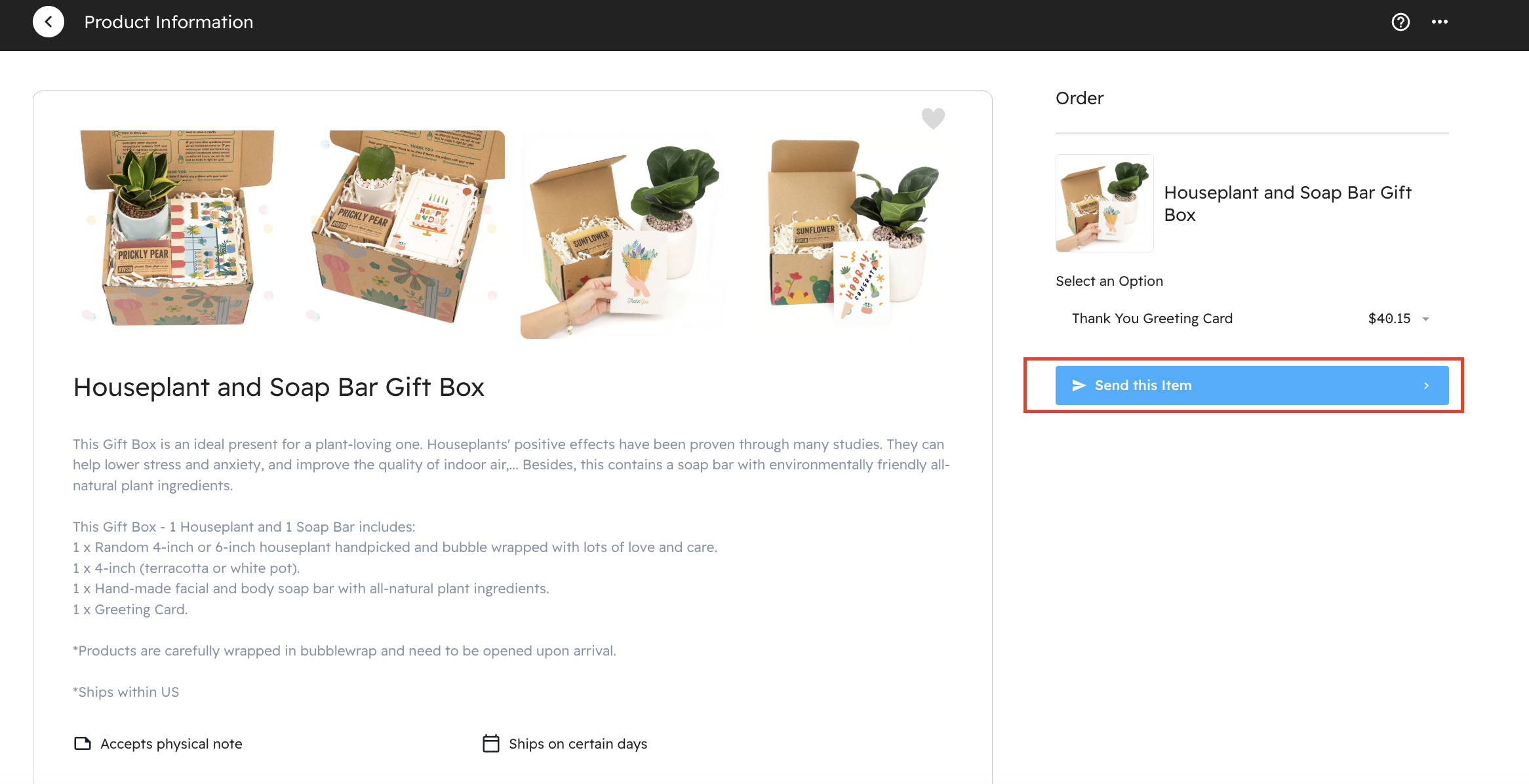 Below we have selected an item (a lovely Houseplant and Soap Bar Gift Box). There is information on this item, including a description and any options or variants.