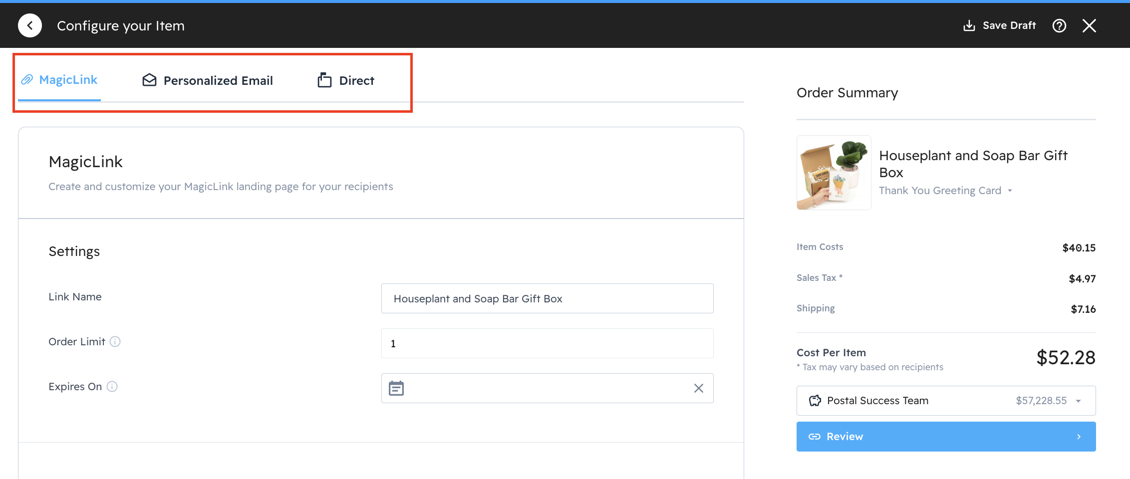 Selecting an Option on the far right will allow you to select the variant (if available) you wish to send. Notice the stock and cost.