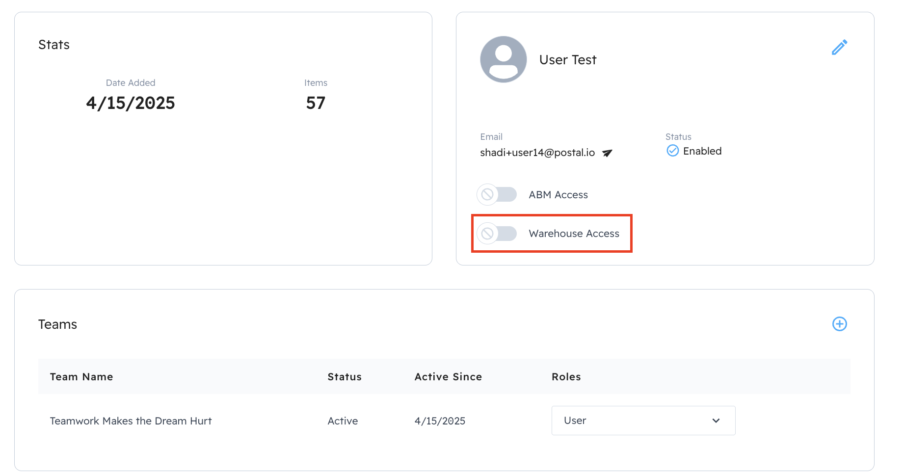 All Warehousing customers with the Admin role already have access to the Postal Warehouse App (as of 9/14/23). Admins can now grant Users access to the Warehousing App by going to Profile & Settings > Users > click on the name to get to their profile > click on the toggle to enable Warehouse Access.
