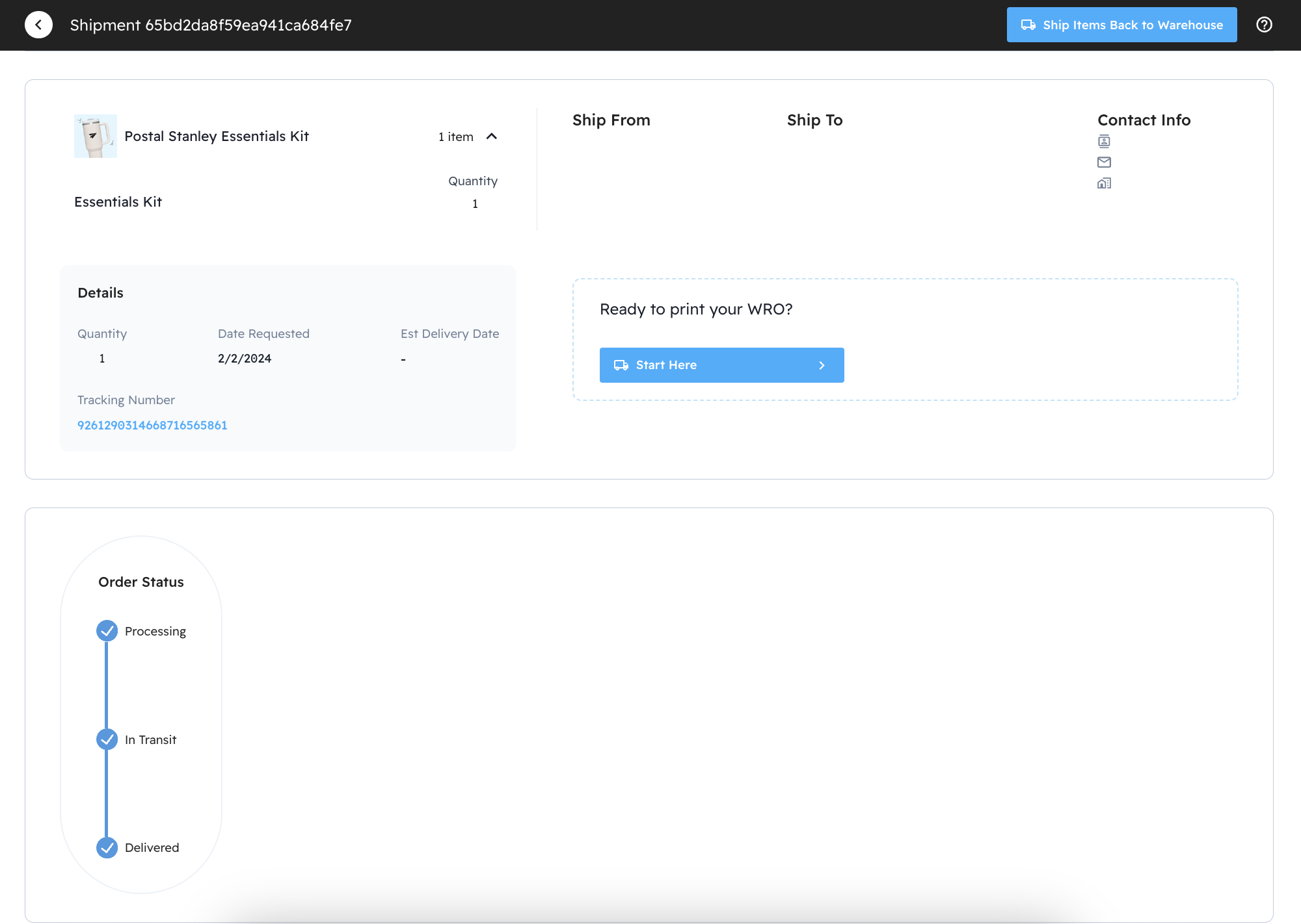 Clicking on an order number allows you to see the shipping details and tracking. From this screen, you can print WRO labels for any items in the shipment that need to be returned to the warehouse.