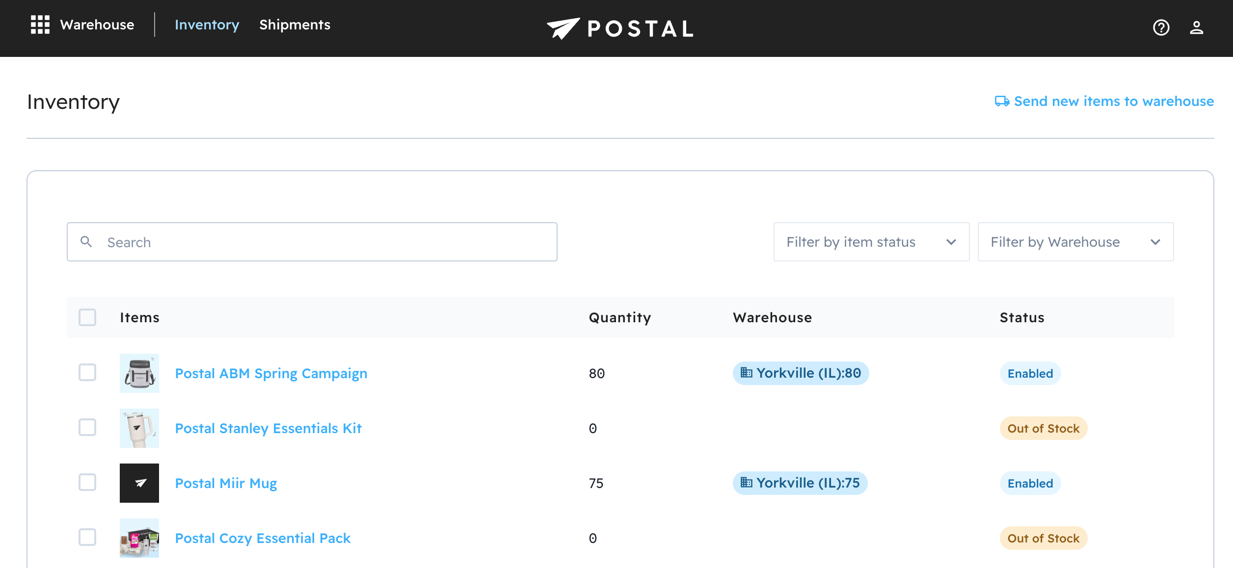 All of your warehoused items are displayed in the Inventory tab. You can search for specific items and/or use the filters to narrow down your search by location and status.