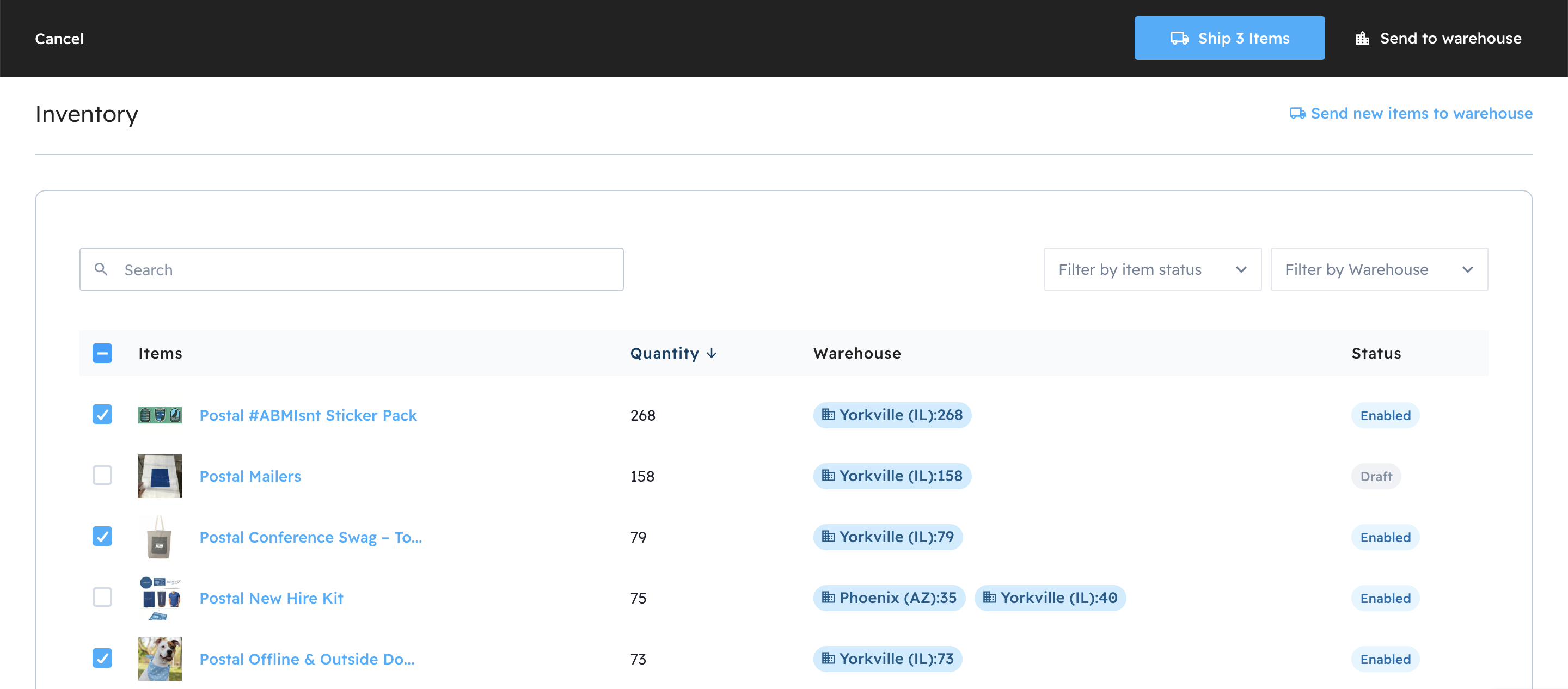 Select the checkbox next to the item(s) you want to send. Items stowed in multiple warehouses will ship from the closest facility to the recipient.