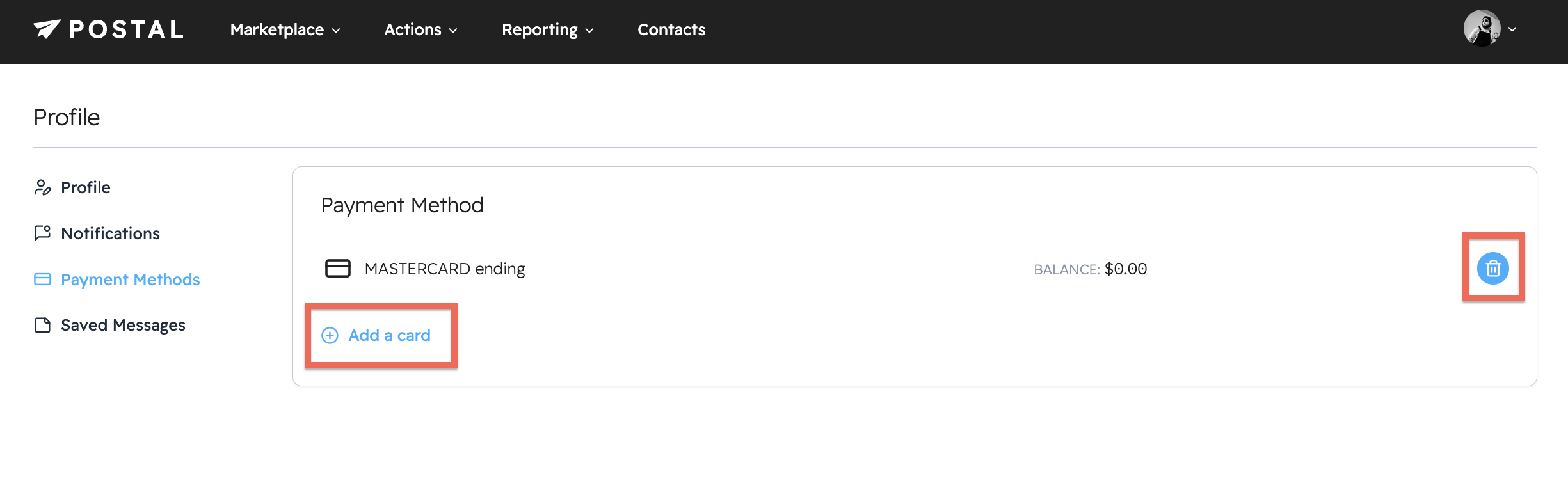 This is where you can add and delete Payment Methods. The Add Payment button prompts you to add CC numbers, expiration dates, CVVs, and an area code. The trash icon deletes your existing payment method.