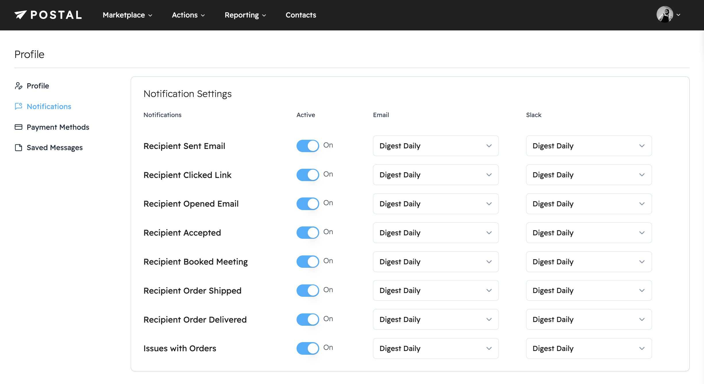 Notifications can come through both Email and Slack and are centered around actions of your recipient and order updates. You can set the frequency of notifications to be in real time or various digest forms and even turn them off completely.