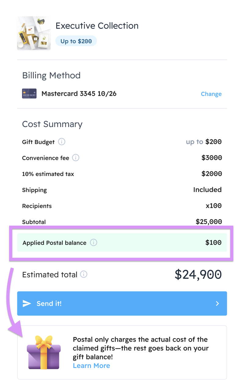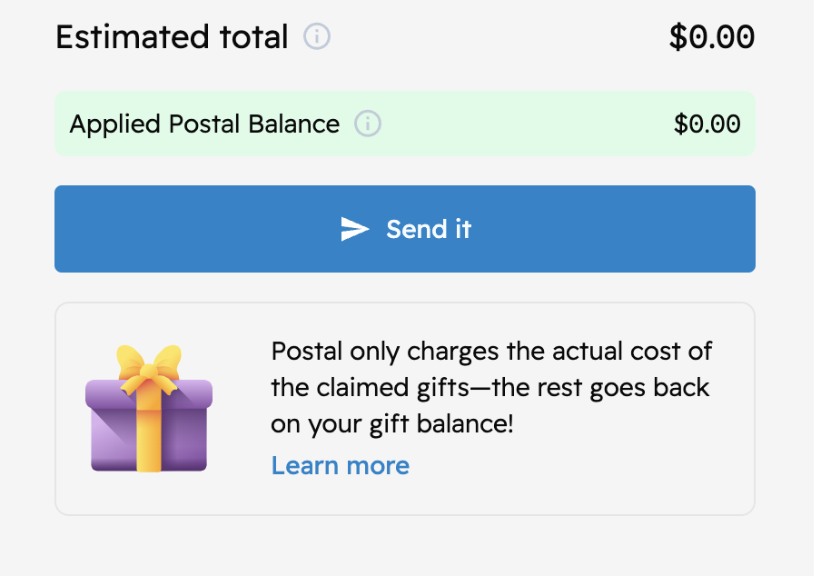 Postal only charges the actual cost of the claimed gifts. The rest goes back to your gift balance!