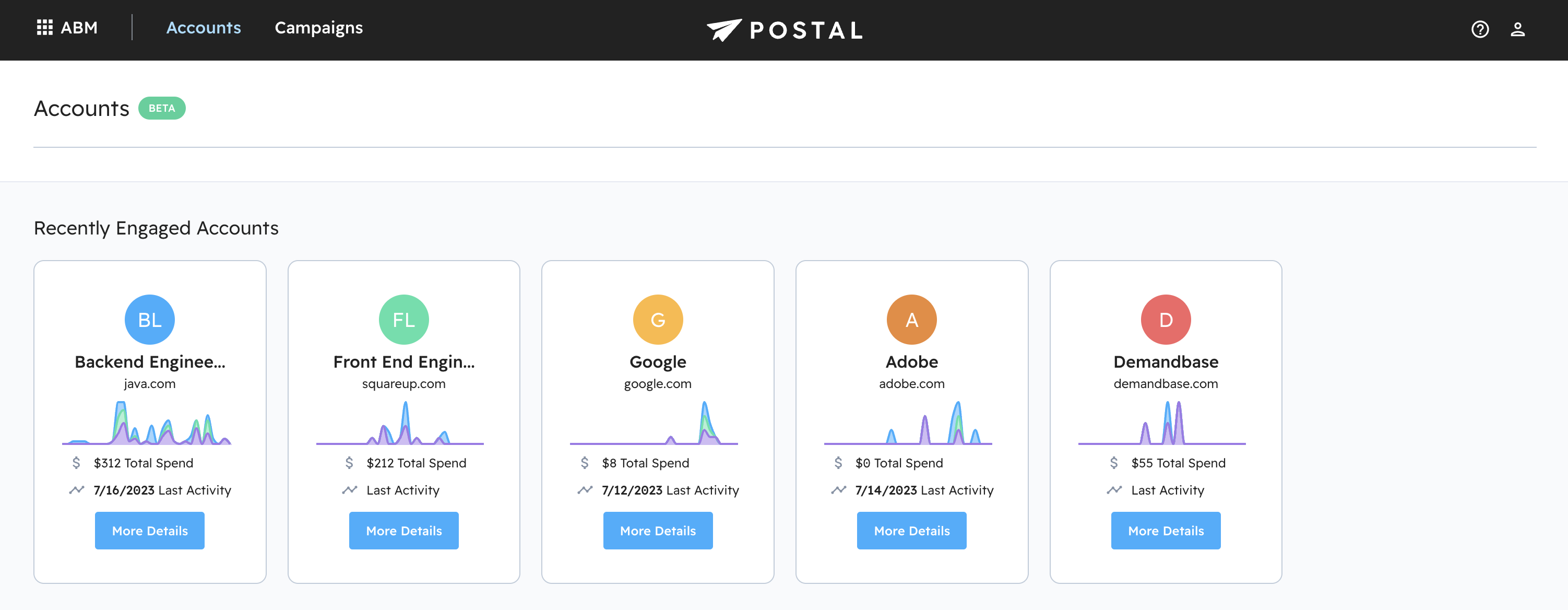 We've made some updates to ABM to include account information in ABM. Now you can see your recently engaged accounts, a timeline of Postal touches, and other various insights.