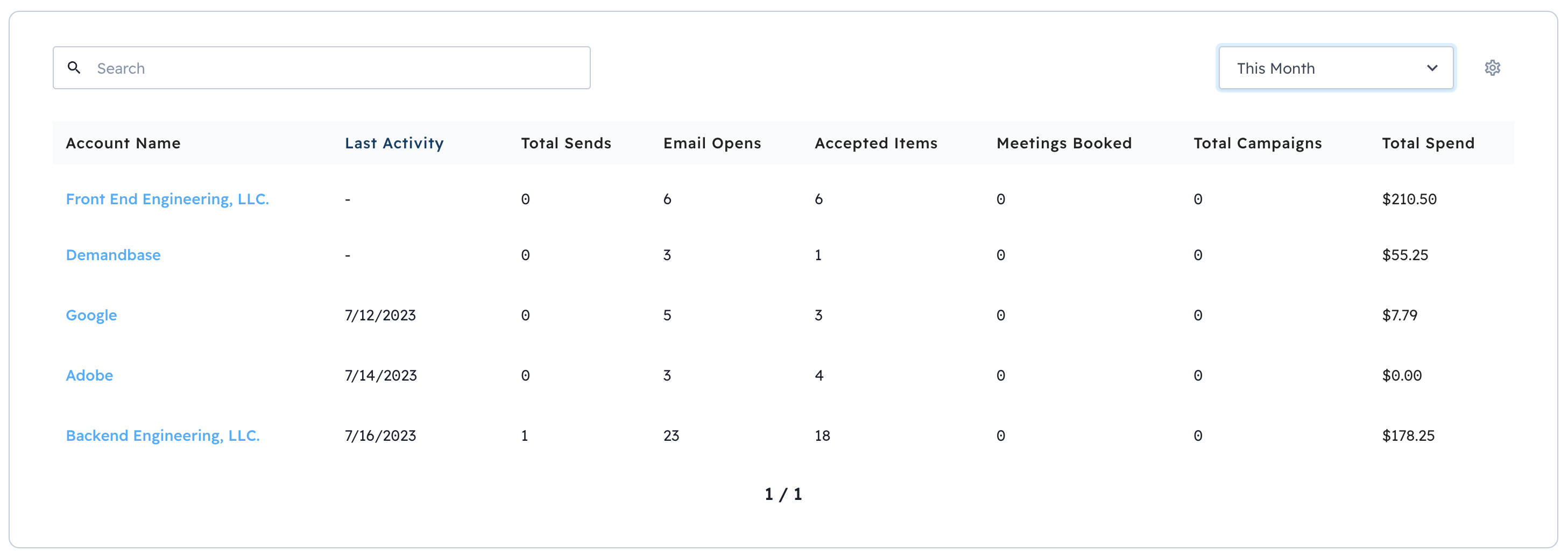 Just below the Recently Engaged Accounts section is the Accounts Report. This is a filterable list that allows you to see all your engaged accounts.