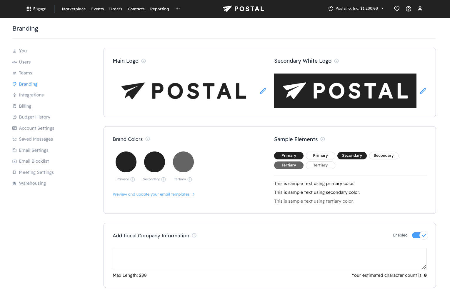 In this guide, we'll get your brand set up inside Postal. Branding your Postal instance brings familiar (and essential) visuals for your users, colleagues, prospects, and customers! Your logo and colors will be used in your Personalized Email and Event Invite workflows as well as Landing Pages. Setting up will take just a few minutes!