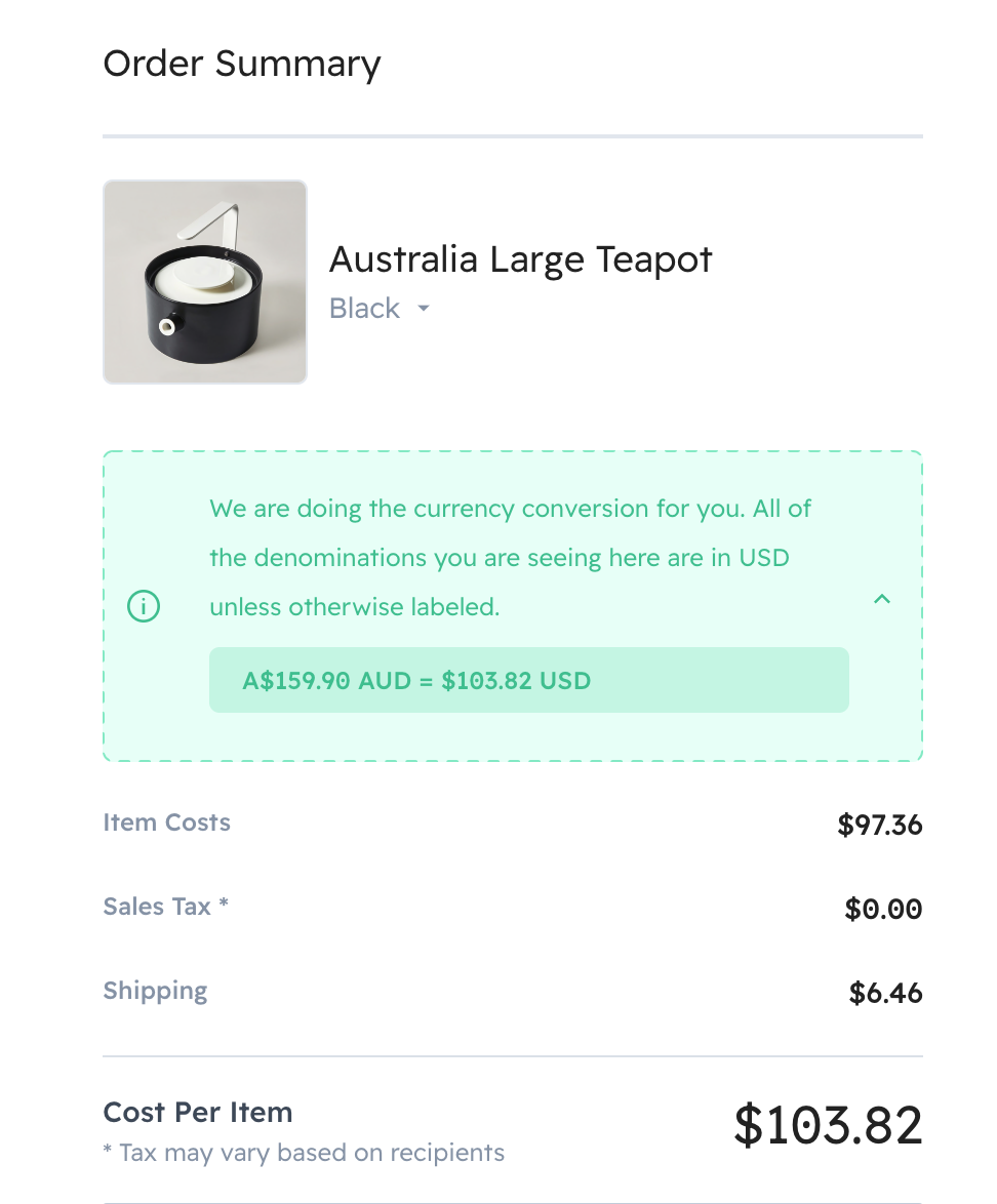 With our currency conversion feature, you’re able to purchase and send items in any currency using just one billing account in your preferred currency. Postal handles the conversion for you (using current exchange rates), making global transactions effortless. No more creating separate billing accounts for each currency.