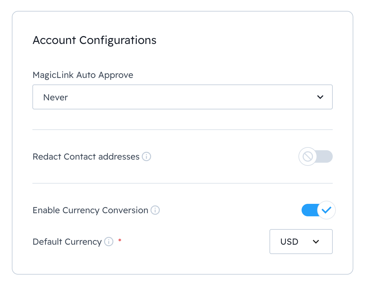 In the Account Configurations section, you’ll see Enable Currency Conversion