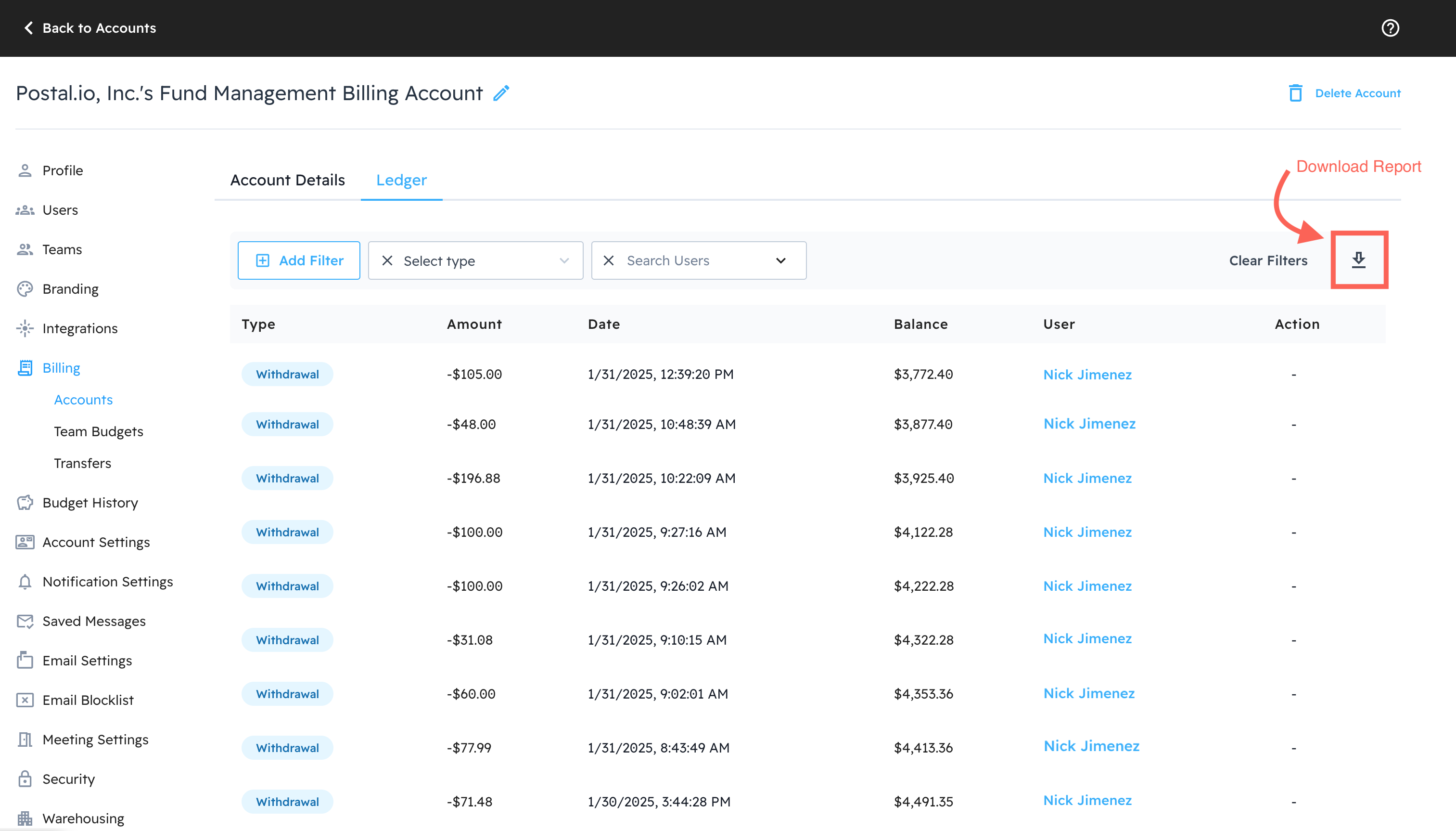 Starting in Postal, select Profile & Settings from the top left. Next, head to Billing > Billing Accounts. Click Edit on the Account you wish to view. On the Account page select Ledger.