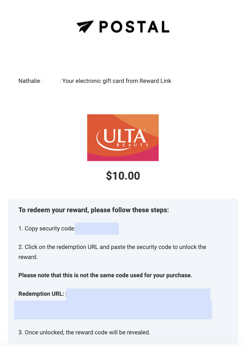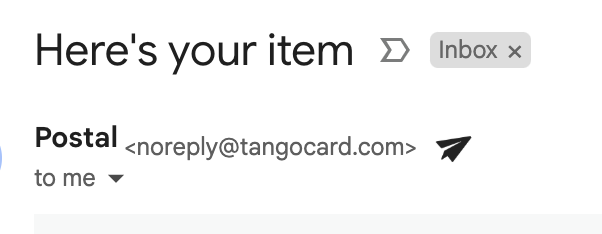 Check your spam or junk folder for an email from noreply@tangocard.com. While Postal does its best to ensure our emails get to you, some email client settings/rules can prevent them from doing so. You can also search your email client for the following terms