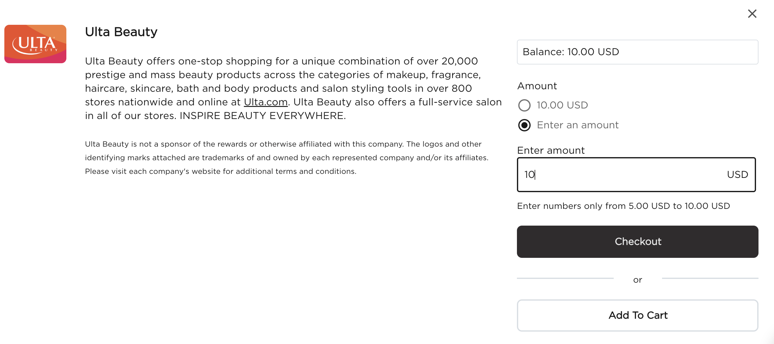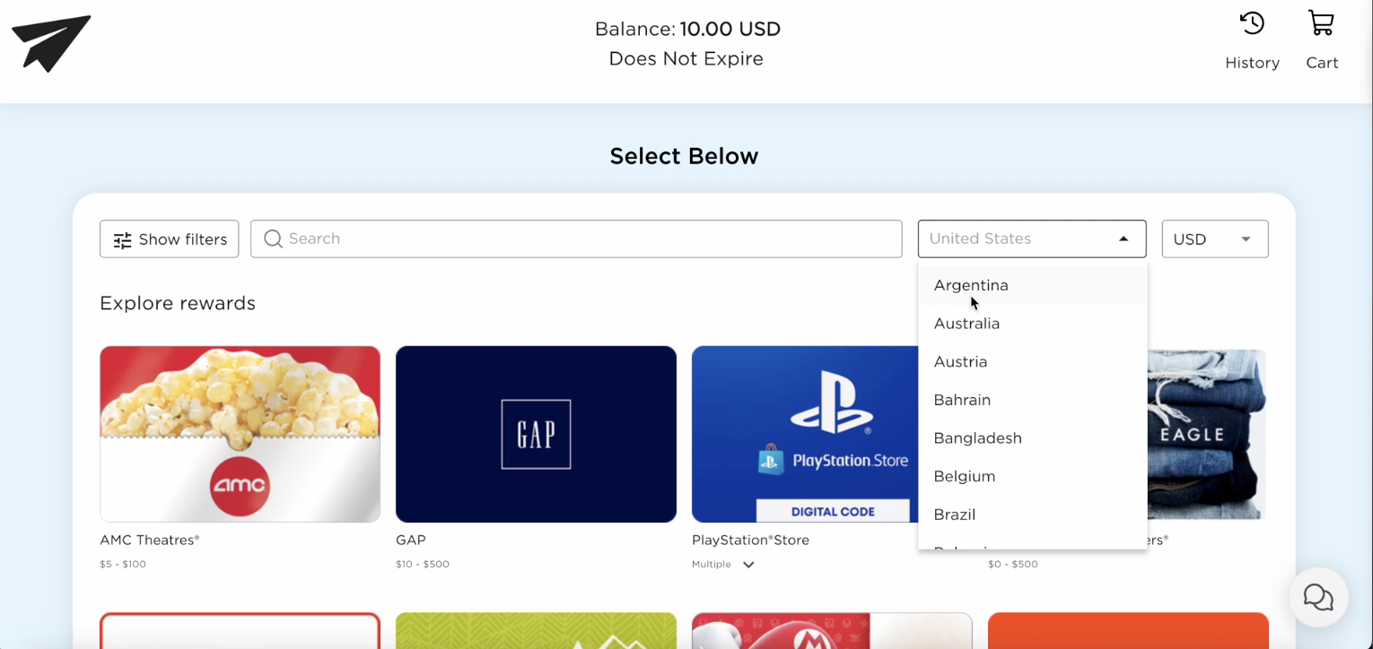 Note: You can use the Search bar to search by a specific gift card, along with using the filters to filter by a specific country or by currency.