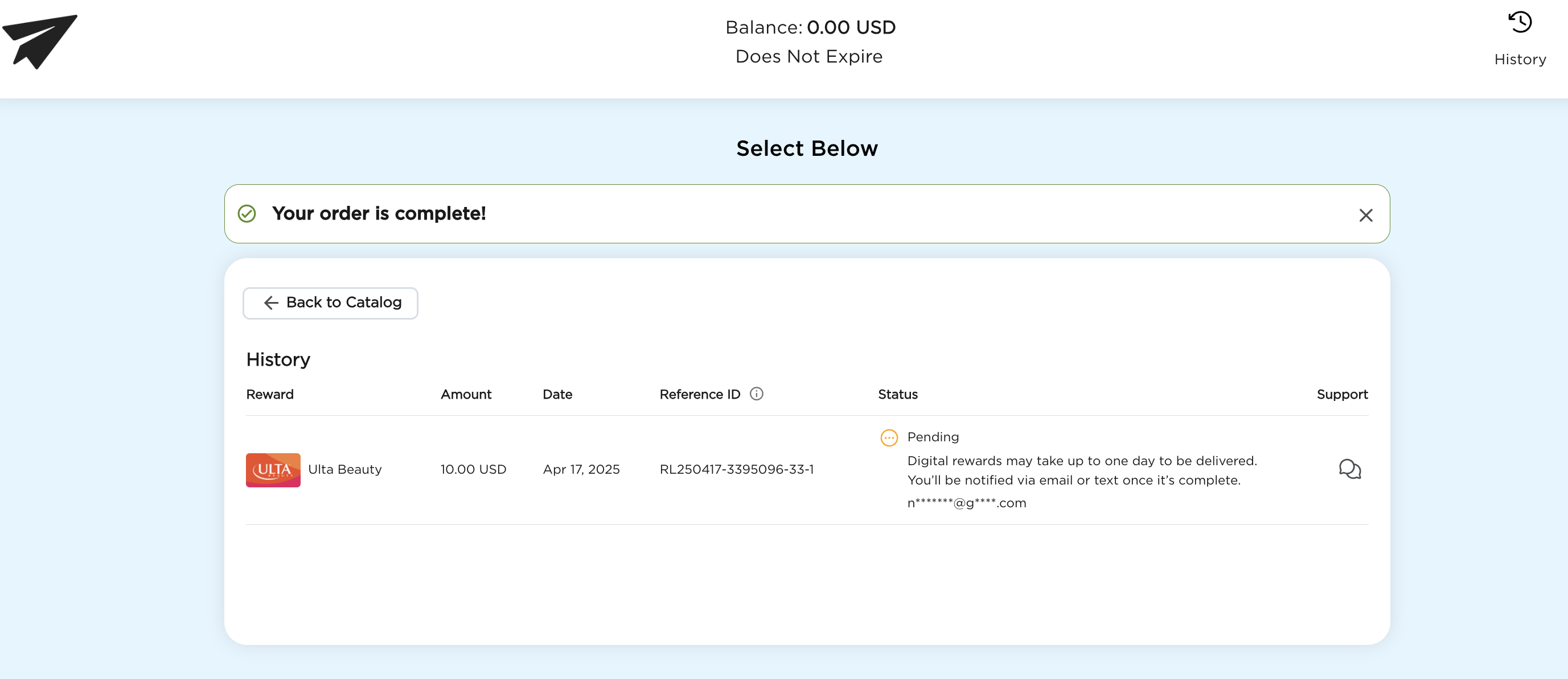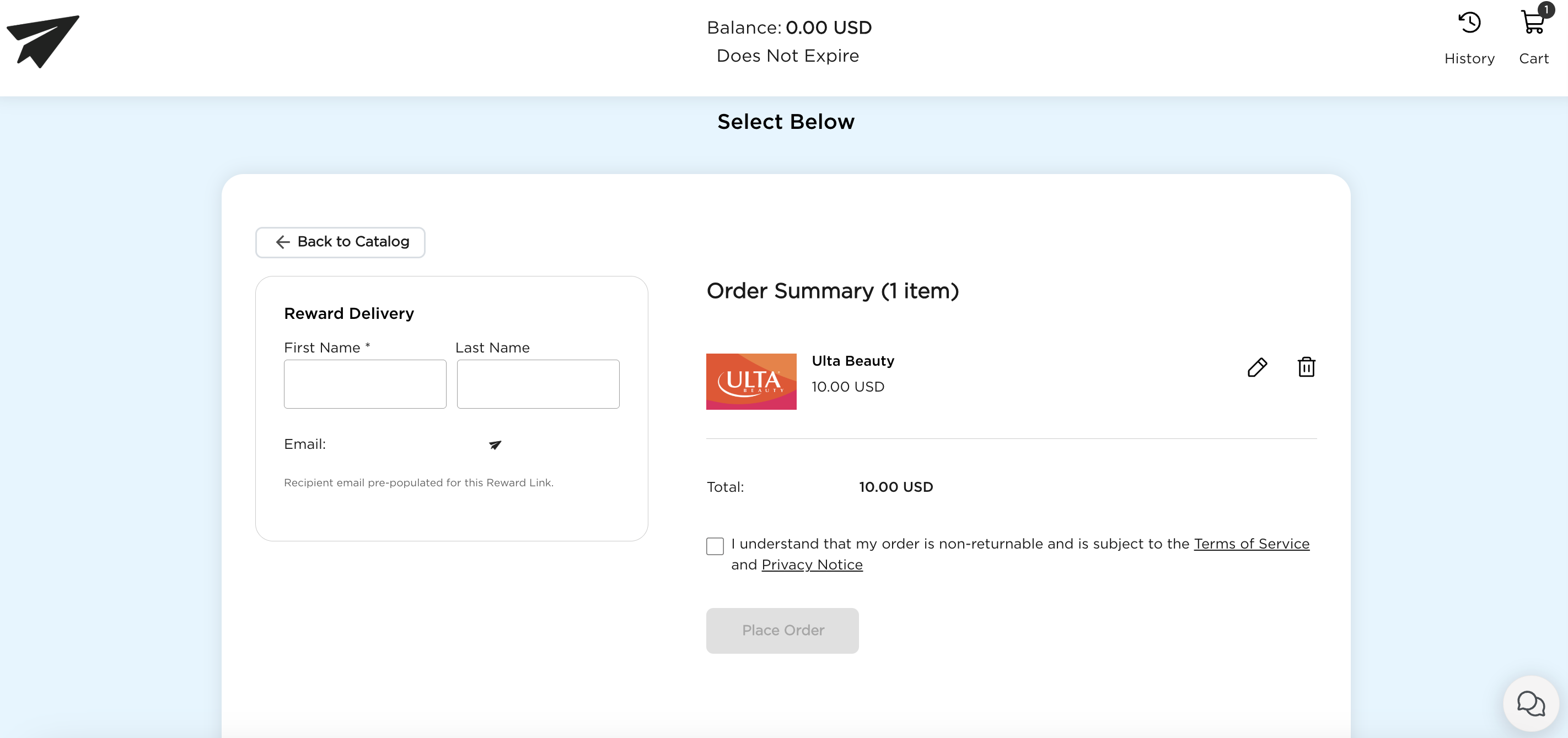 Step 6 - Checkout. You will be taken to a screen where you will see your personal details under Reward Delivery. To the right, under order summary, you will agree to the terms and select Place Order.