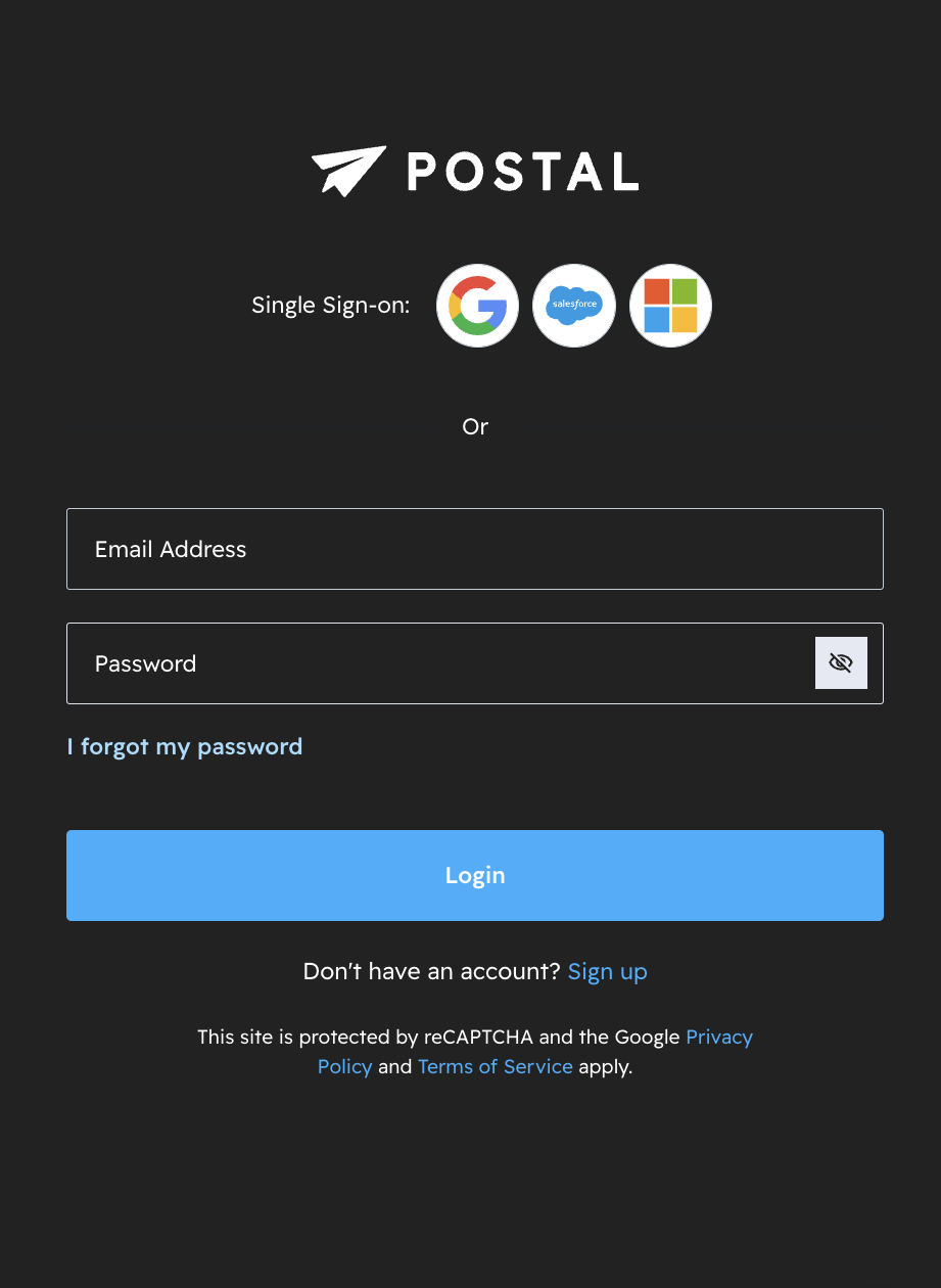 We recommend using Single Sign On (SSO) for ease of access and to prevent password fatigue. SSO can be used on the login page and when using the Postal Browser Extension.