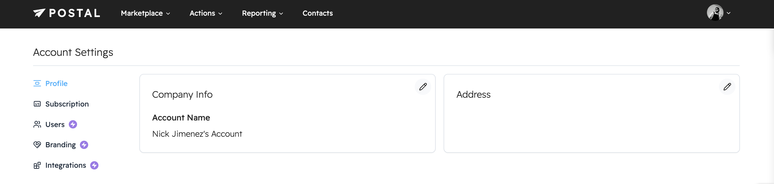 Profile is where you can update company information including your Account name and Address.