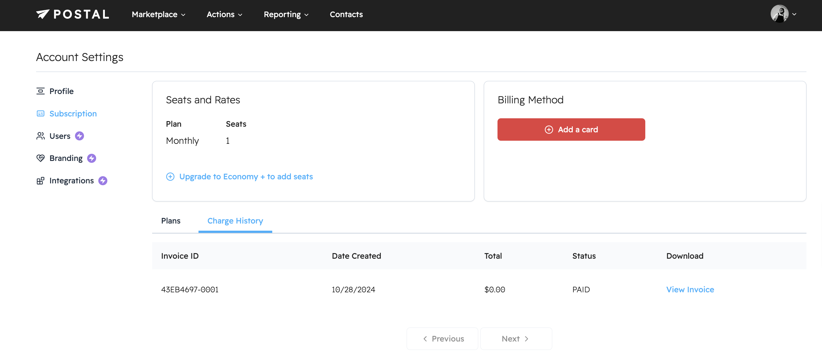 The Subscriptions section contains information about your Seats & Rates as it pertains to your subscription.
